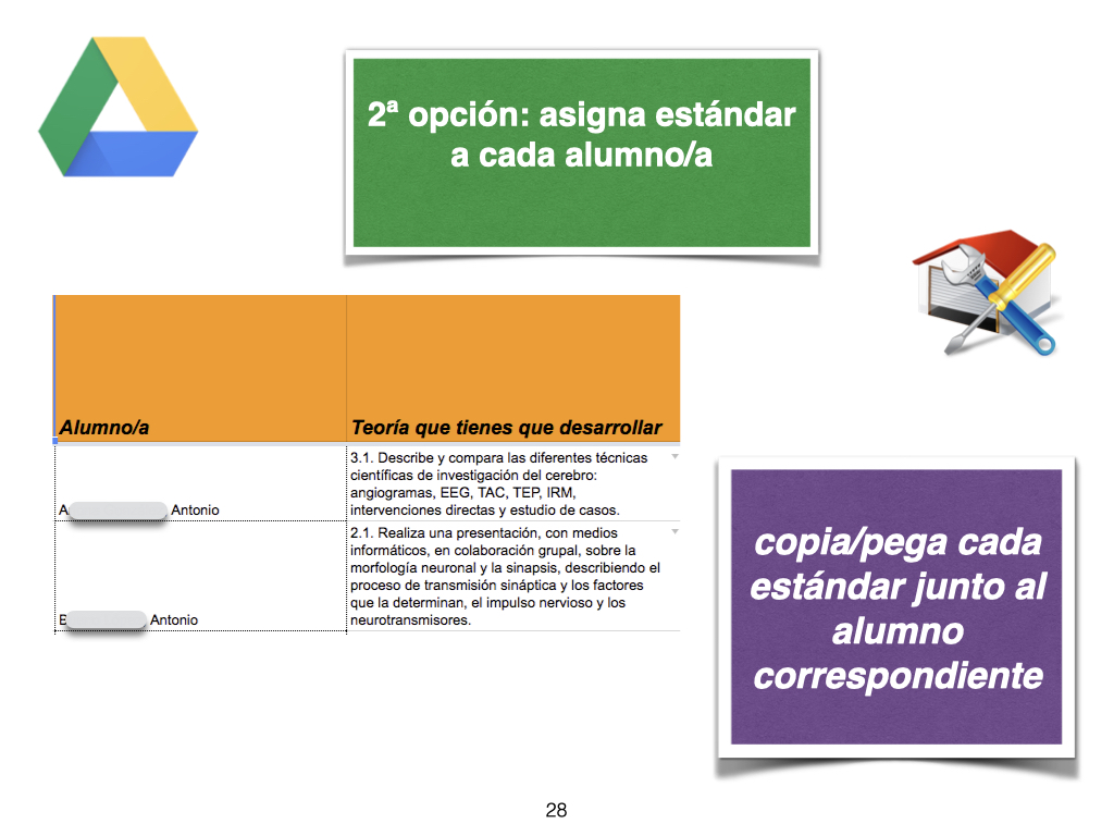 Debajo podemos ver otro uso de nuestra tabla con alumnos. Asignamos como tarea un estándar o bien un criterio de evaluación como tema sobre el que debe trabajar.