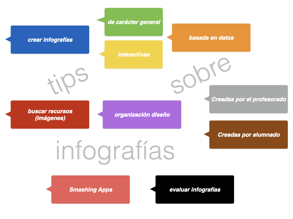 Existen muchos tipos de infografía según el propósito que pretendamos. Dividiría en infografía de carácter general, interactivas, y basadas en datos. Al mismo tiempo, siempre que propongamos trabajos infográficos al estudiante hay que orientarlos sobre la búsqueda de los recursos que necesitarán para las mismas. Por último, como en todos los proyectos hay que mostrarles cómo vamos a evaluar (rúbricas).
