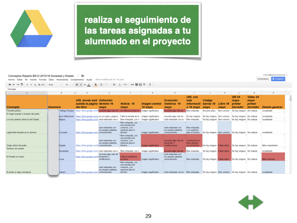 En la imagen se observa cómo, mediante con las columnas adecuadas, podemos ir marcando el progreso de cada alumno para cada item. El sistema es lo bastante visual y rápido para hacer un seguimiento eficiente y constatar la mejora después de un número adecuado de borradores.
