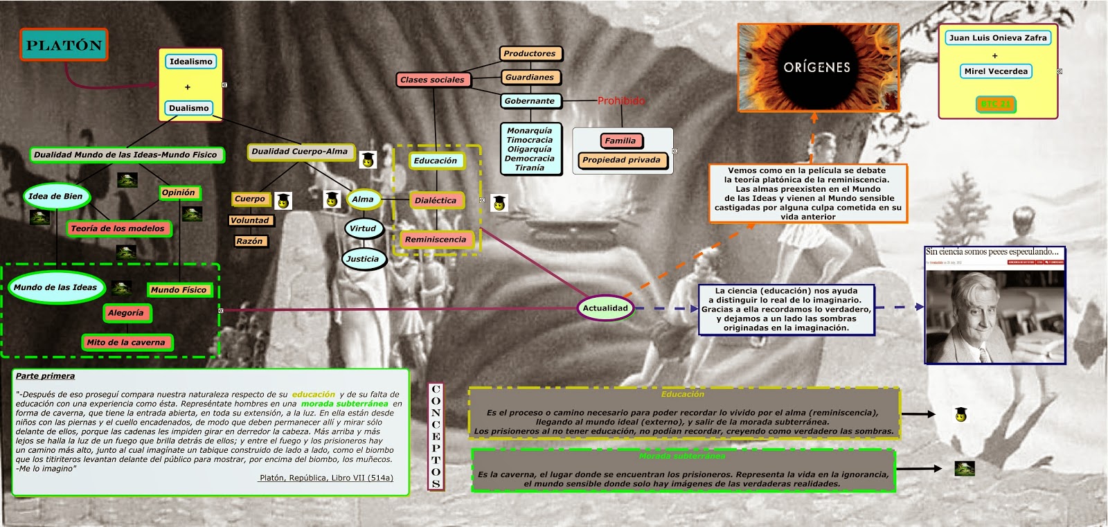 La infografía que traigo a continuación es diferente. Se trata de la visualización de algo tan 'textual' como un comentario de texto. En la misma puede observarse el texto y las líneas quieren marcar las relaciones entre los concetps. Asimismo se les pedía cierta relación con otras imágenes y recursos como noticias que hubiéramos utilizado en clase.