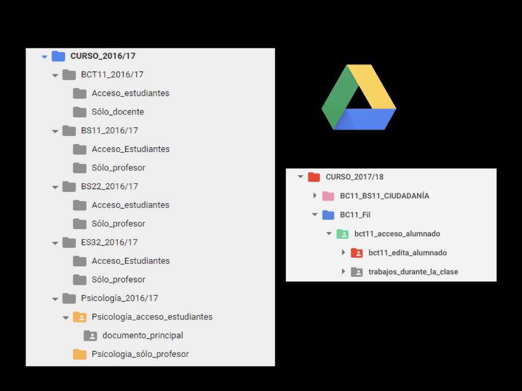 Todo comienza con un gran almacén. Voy a escoger Drive de Google por su rápida incorporación a los centros. Si bien serviría cualquier otra similar como Dropbox, Icloud, etc. He visto memorias USB perdidas en la cafetería, en el baño, en el aparcamiento. He visto pendrives rotos, robados, cientos de exámenes, memorias de programación, unidades didácticas de años de trabajo perdidas para siempre. Solo tengo un consejo, no uses ese tipo de dispositivos para tus recursos de aula. Vamos a subir todo a la nube. Allí lo tendremos siempre a salvo. Solo tenemos que organizarlo. Voy a proponer una estructura trivial pero imprescindible. Una carpeta con el curso 202_ . Dentro una carpeta para cada grupo de clase. Dentro de cada grupo de clase, una para que el alumnado solo pueda 'ver', y otra para que el alumnado pueda editar. Puede quedar más claro en la siguiente imagen.