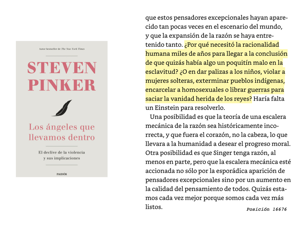 Si estás en un curso sobre herramientas digitales para ciencias sociales y humanidades, seguro que la lectura es una obsesión en tu asignatura. Sabemos que la competencia lingüística es la base de todo, y que el alumnado no lee libros. Por eso, mientras leía 'Los ángeles que llevamos dentro', la obra del psicólogo Steven Pinker donde describe cómo la violencia ha ido disminuyendo a lo largo de la historia, subrayaba montones de párrafos para mi alumnado, y me preguntaba cómo hacer para que el estudiante reciba el mensaje del autor, reflexione y comprenda la profunda implicación que tiene para la sociedad en la que vivimos.